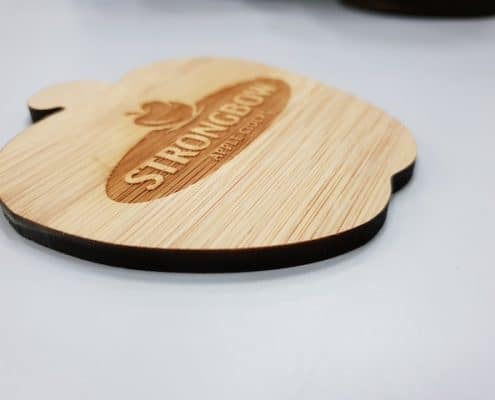 Een PR Agency uit België kwam in januari met het volgende verzoek: “Voor een specifieke klant zouden wij graag een offerte opvragen voor 200 houten onderleggers met als gravure “Strongbow”. In de bijlage kan je een beeld van onderleggers terugvinden dat we in ons hoofd hadden, maar ook het logo dat we graag erop zouden hebben.”